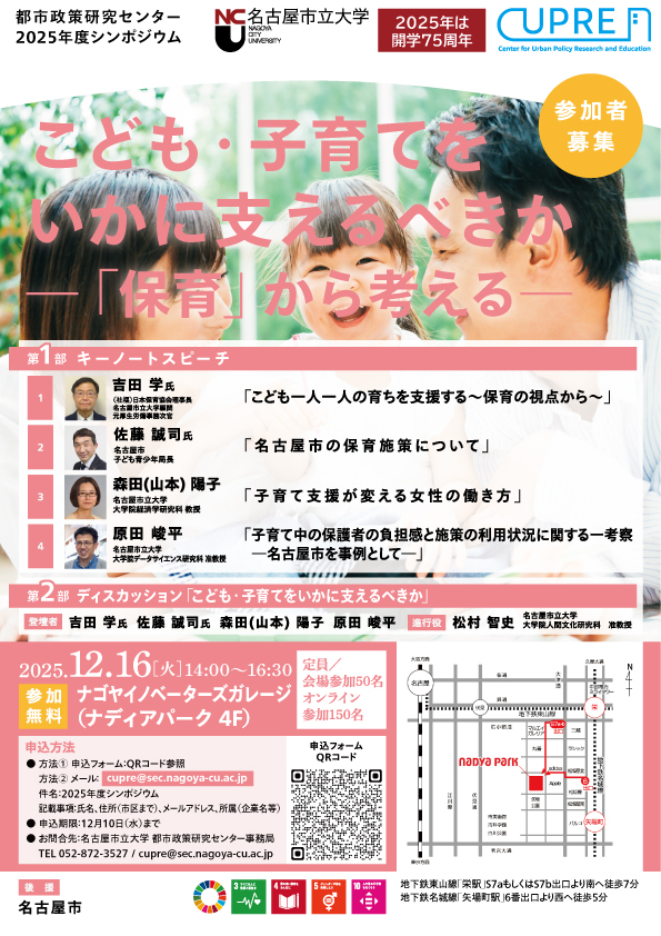 「こども・子育てをいかに支えるべきか―「保育」から考える―」の開催!募集概要 タイトル「こども・子育てをいかに支えるべきか―「保育」から考える―」概要保育の観点から、こども・子育てをいかに支えるべきか問い直し、未来に向けたあり方を、保育事業者・行政・研究者の立場から多角的に議論するシンポ […] -
